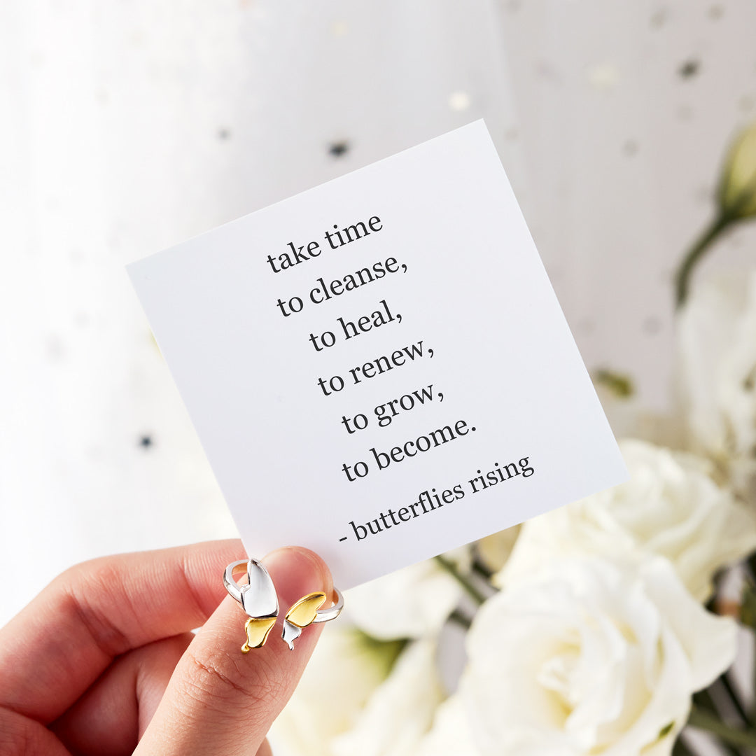The butterfly is a symbol of transformation and new beginnings.With an inspiring message card included, this Two-Tone Butterfly Ring is the perfect spirit-lifting giftfor a loved one or yourself, itserves as a compelling reminder that all good things take time.