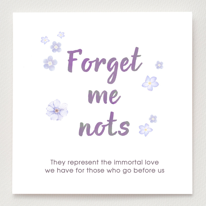 The memory never fades, like the vivid blue blossoms of this Forget Me Not Ring. It represents remembrance - we know they are never far. Instead of right beside us, they will be carried in our hearts. A reminder of the love that cannot be lost.