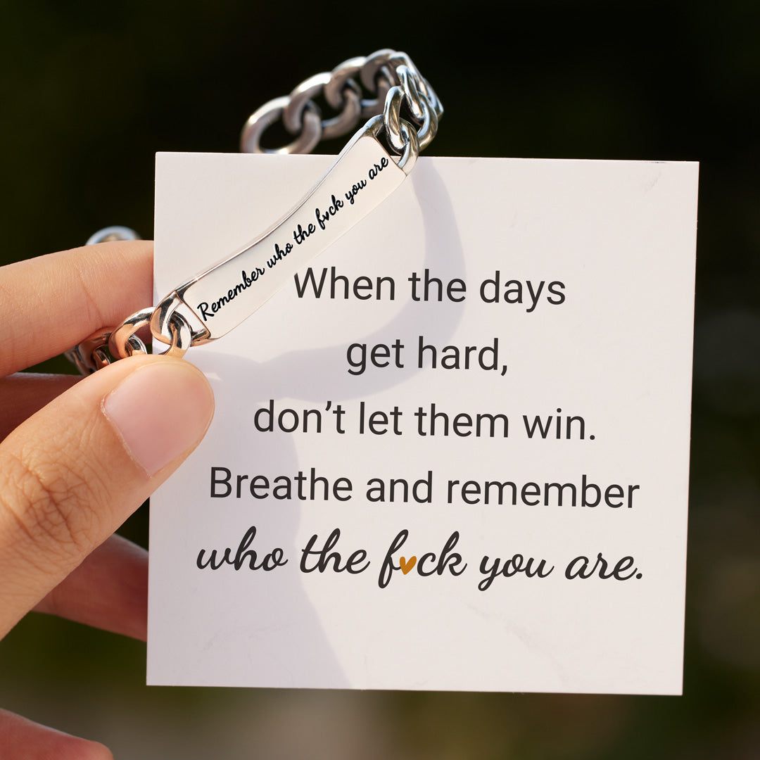 Gift your daughter a special reminder of her unique identity with this 'Remember Who The Fuck You Are' Braided Bangle! This cozy bangle features intricate braiding and subtle messaging that makes it a stylish way to help her stay true to herself. Show her the power of self-expression!